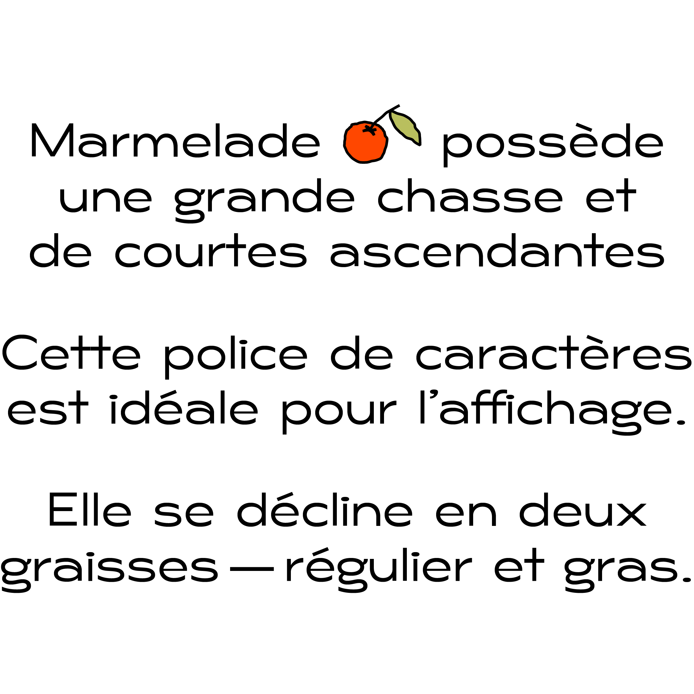 Marmelade est une police de caractères se déclinant en deux graisses — régulier et gras. Elle possède une grande chasse et de très courtes ascendantes. Marmelade est fluide, tout en courbe et en largeur. En plus des extrémités tronquées à la verticale, ce sont les aspects énumérés précédemment qui lui donne son air sympathique. Marmelade est une police d’affichage, son usage est donc idéal pour des impressions de grands formats.